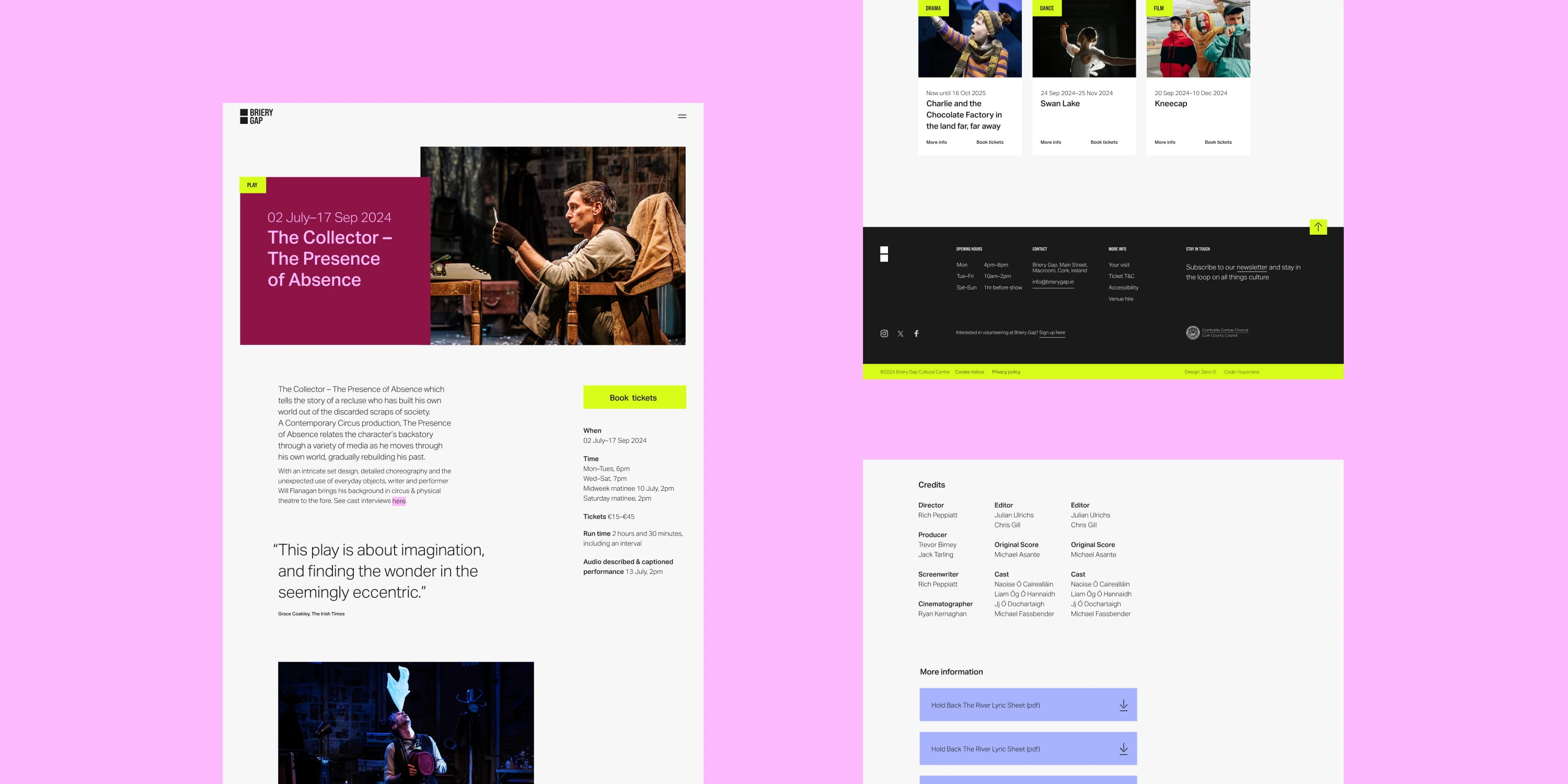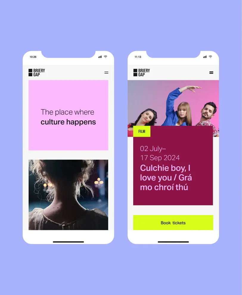 We worked with Briery Gap to develop a new identity and website that reflects its bold vision. At the core of this was the idea of placemaking — creating an identity that not only represents the venue but reinforces its role as a cultural landmark. The new identity is flexible and vibrant, with colours born from Macroom’s built environment. The brutalist logo, influenced by the architecture of the building, serves as a metaphorical window into culture.